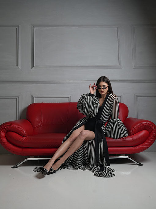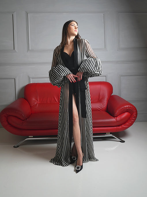 Do you desire an exclusive resort experience that sets you apart from the crowd? Look no further than the Black and White Stripe Kimono by Desire Avenue. Our Kimono is not just an outfit; it's a statement, an embodiment of individuality, and a symbol of luxury.