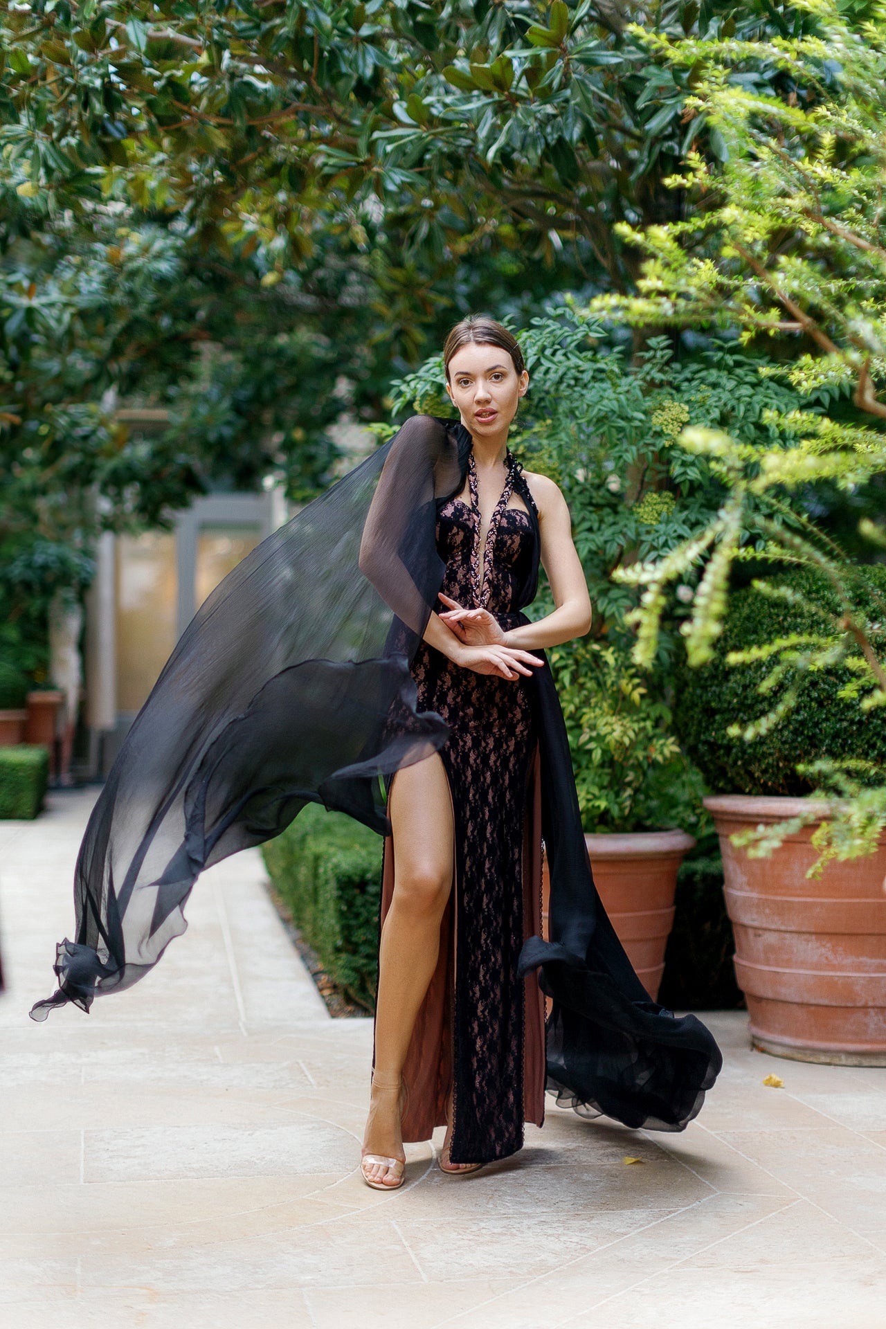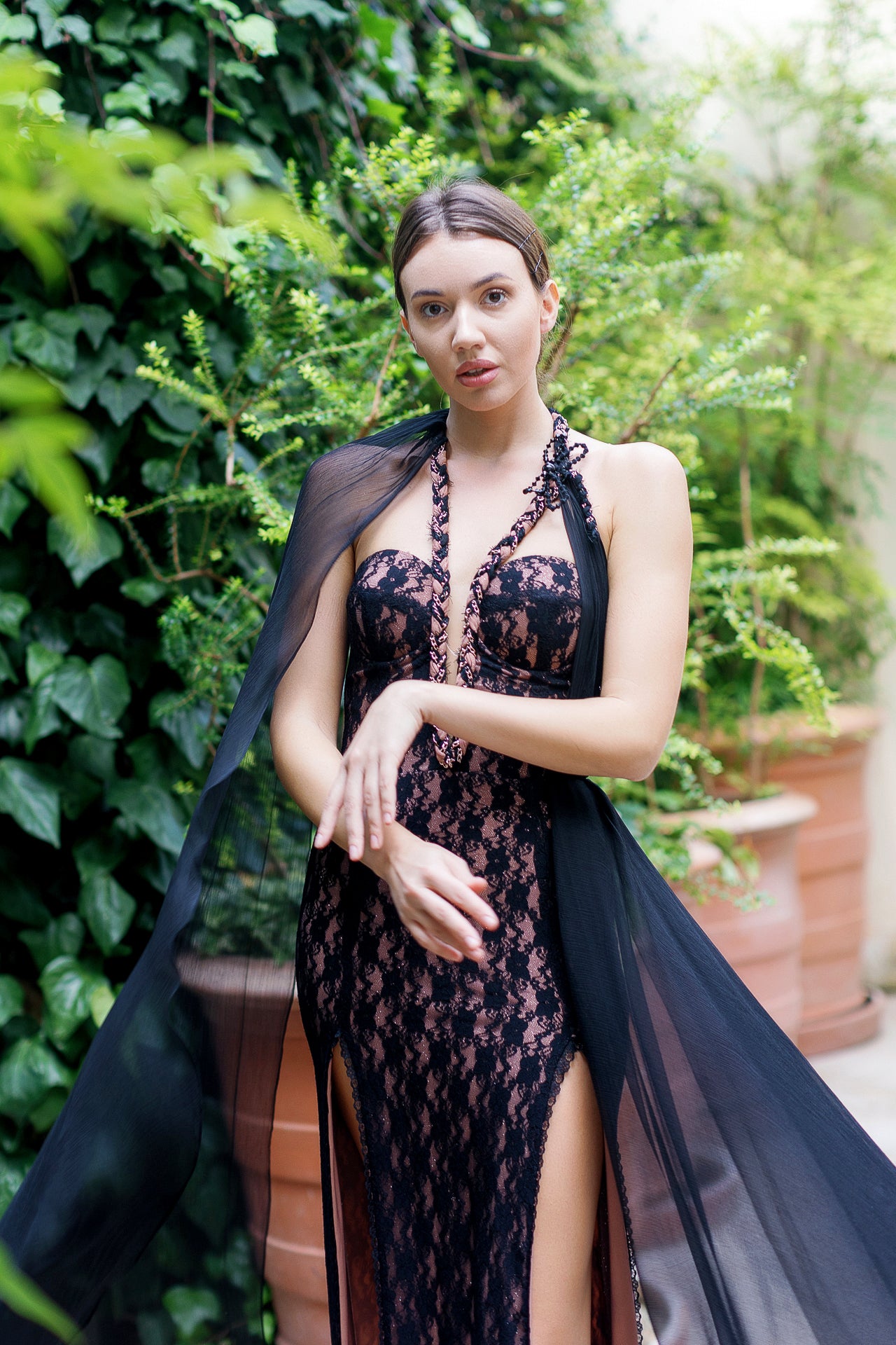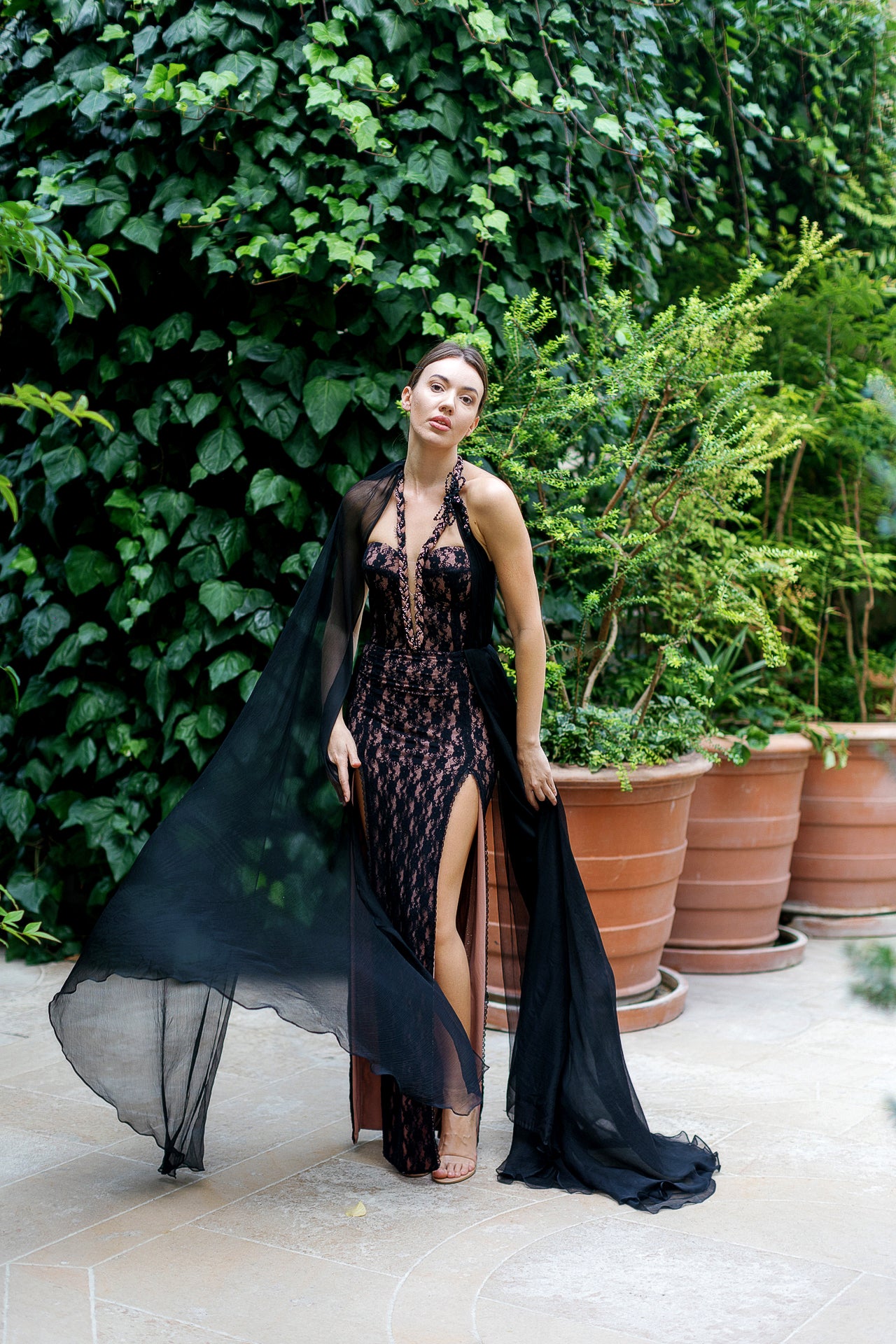 The dress is a masterpiece of design, constructed from elastic black chantilly lace that embodies sophistication and comfort. On the shoulders, silk chiffon flows seamlessly, resembling the ethereal wings of a dragonfly.
