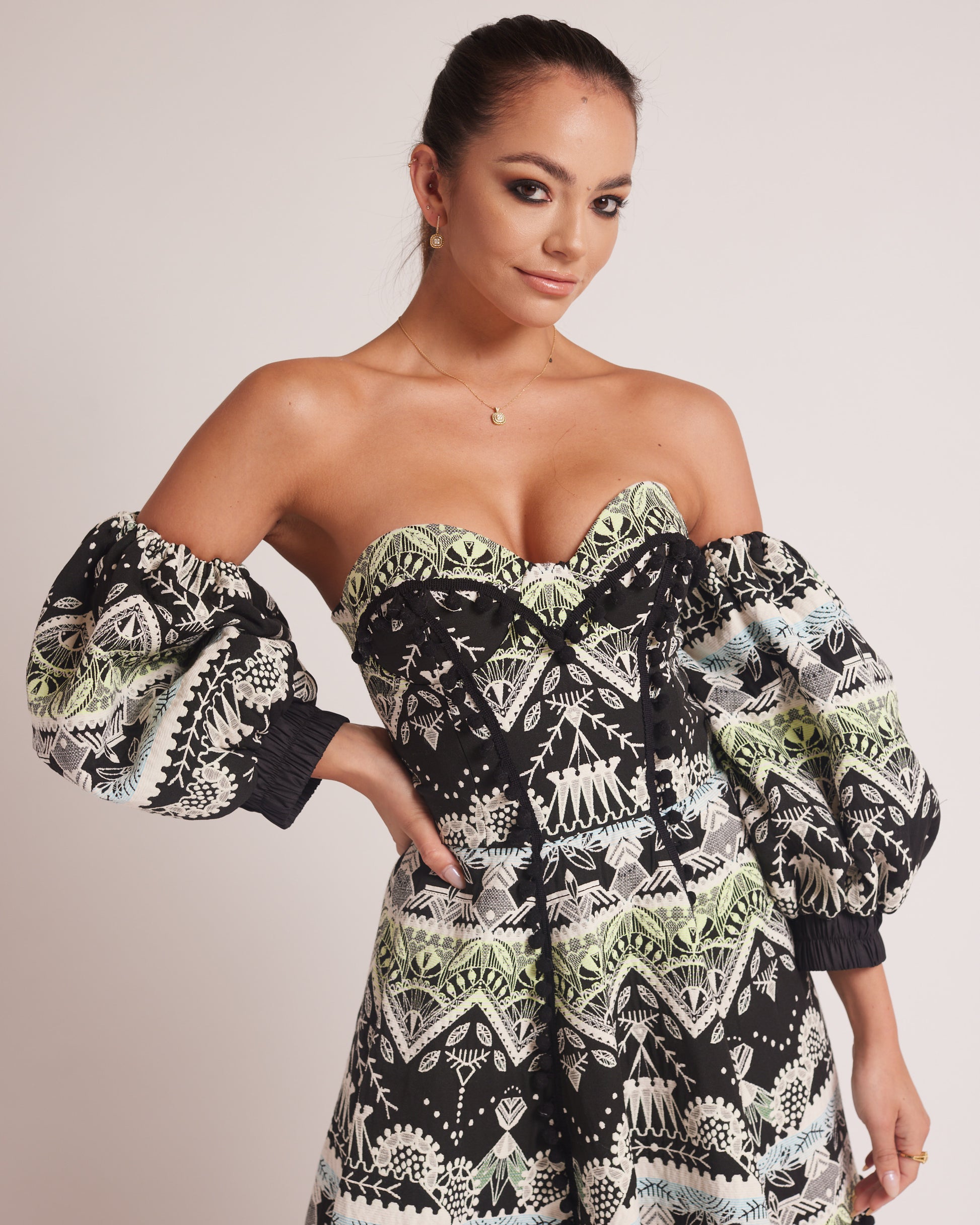 It’s a corset inspired shape with molded cups and bonning. The sweetheart neckline frames your décolletage while the skirt part creates the romantic feeling. It has detachable sleeves that helps you to create perfect style.