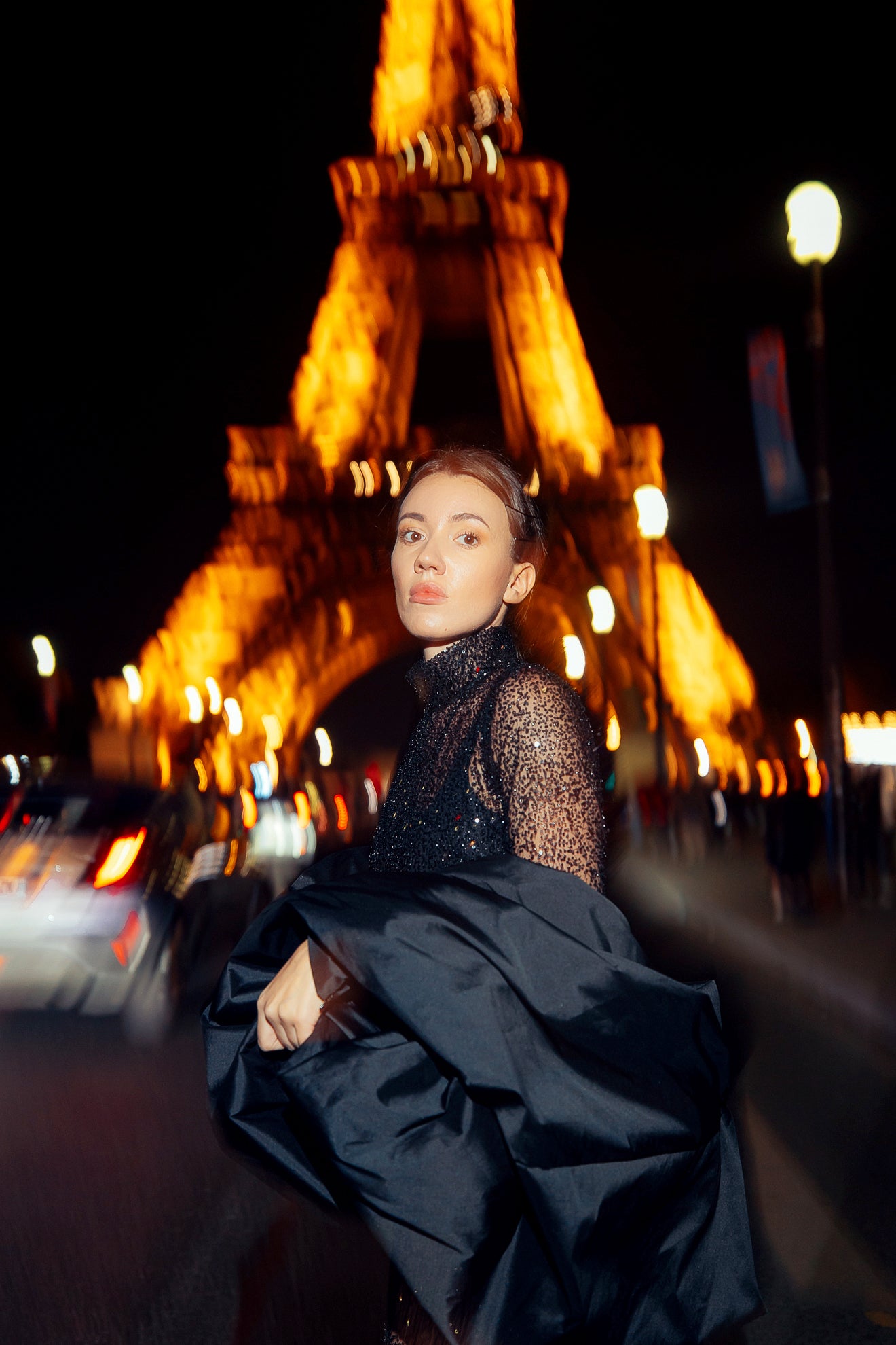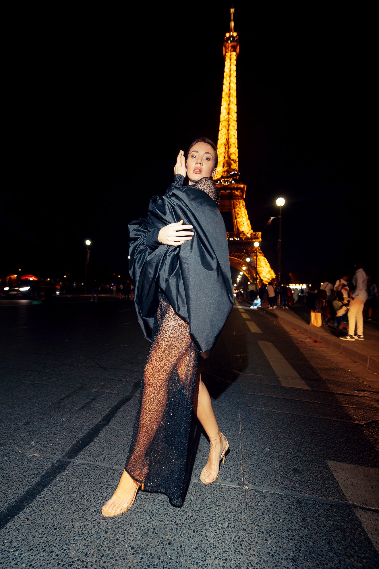 This dress is a statement of sheer elegance, providing you with the freedom to customize your style while maintaining an aura of sophistication and allure. This unique creation has been paired with our signature black taffeta cocoon for a more daring and distinctive ensemble. This dress exudes an attitude that demands attention and captures the essence of true luxury.