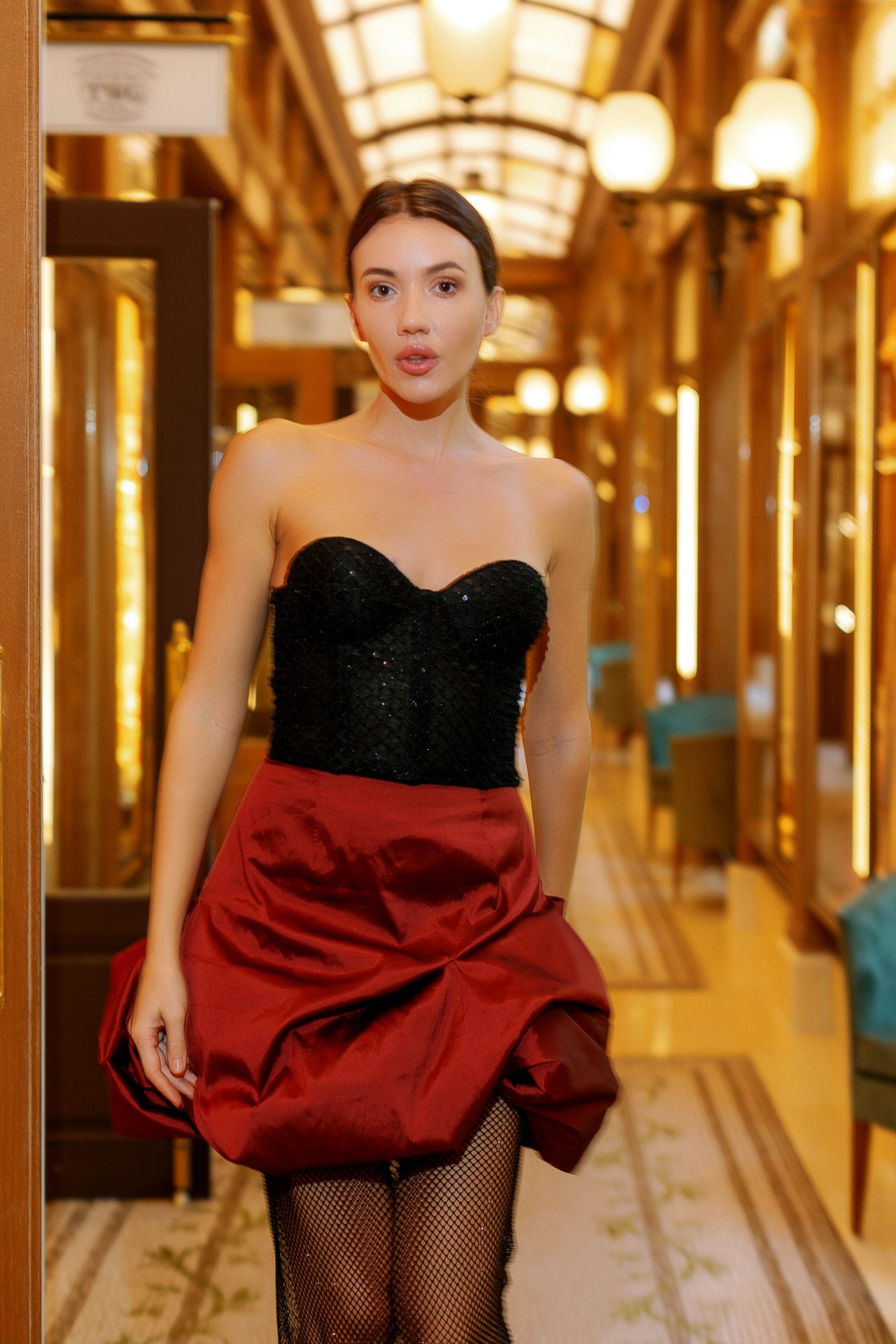 This unique design accentuates your form, and as it transitions upwards, it gracefully merges into a taffeta short skirt that beautifully mirrors the form and delicate petals of a poppy flower.