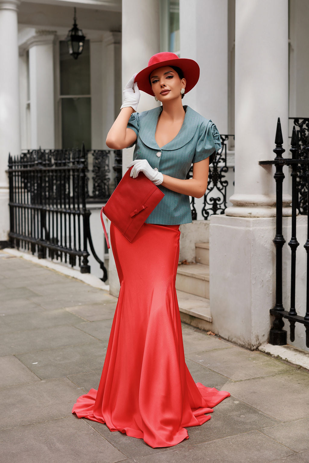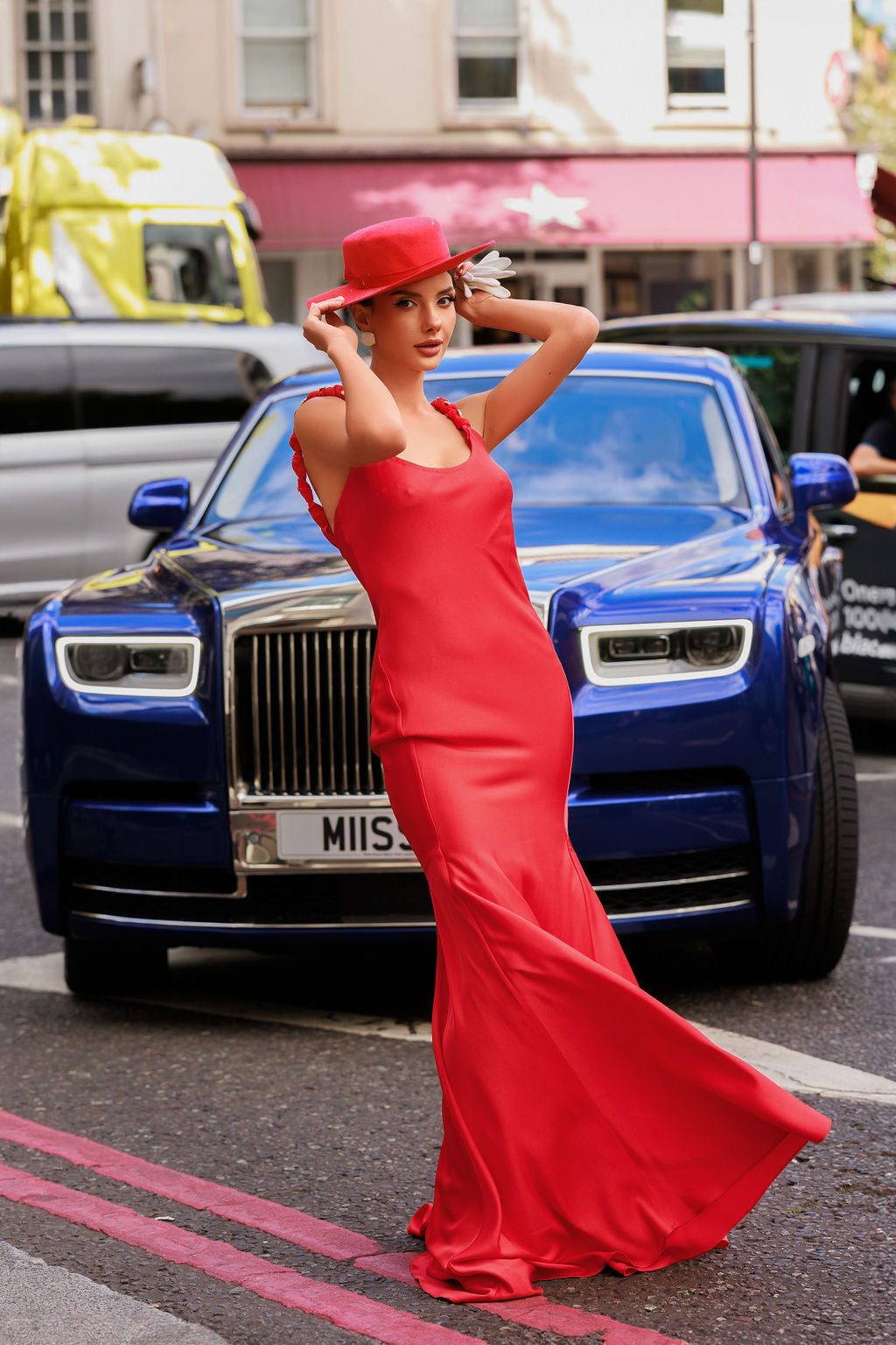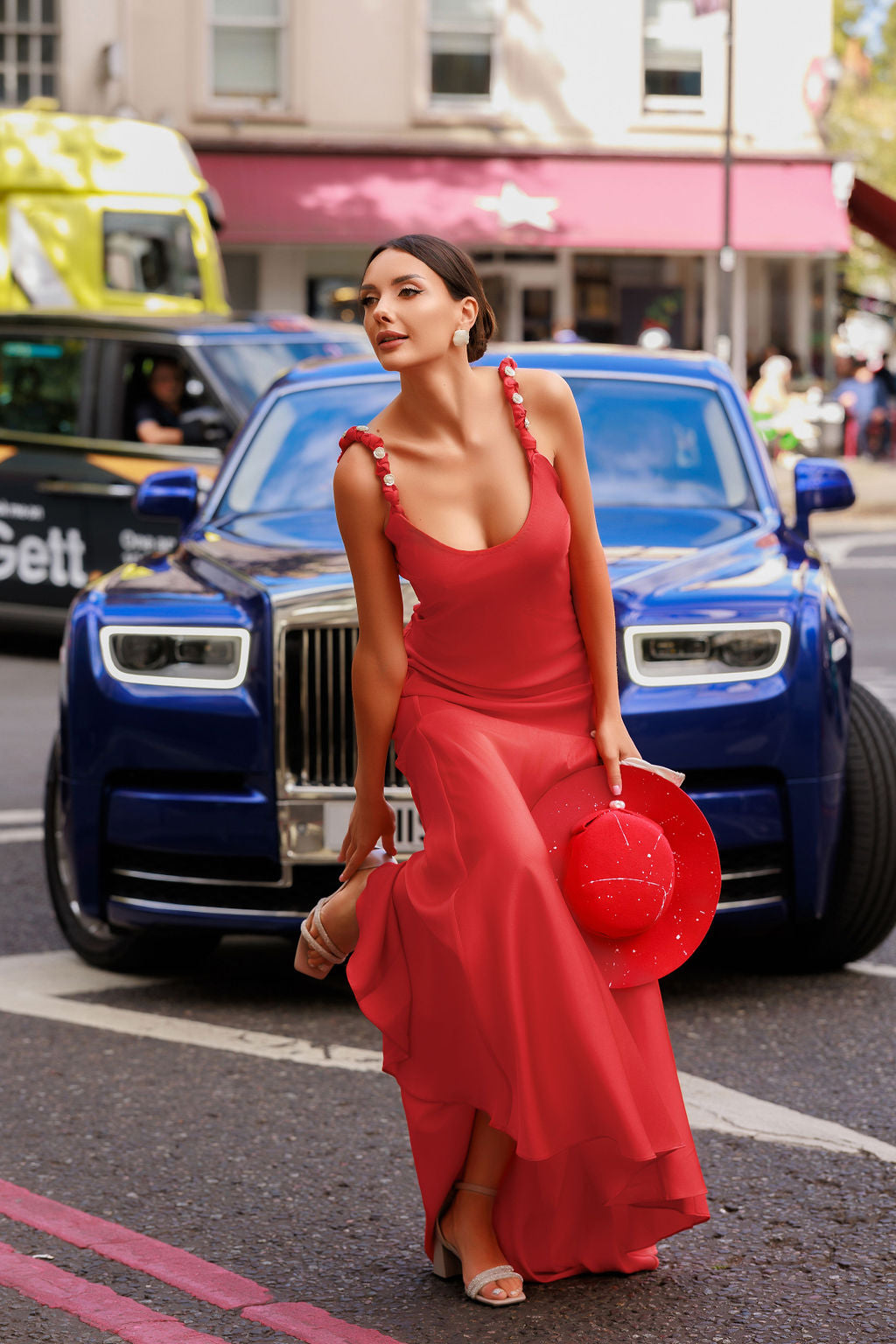 Dare to turn heads and make an unforgettable entrance in this captivating red satin crepe maxi dress. Featuring unique, rose-shaped button details on the straps and a flattering, figure-hugging design, this dress is made to celebrate your confidence and elegance. The dramatic train adds a touch of glamour, creating a flow with every step you take. Whether it’s a gala, evening event, or special celebration, this dress demands attention.